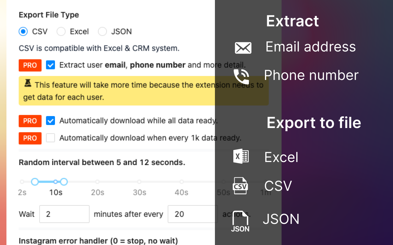 Super easy to use, one click to export Instagram post list by Instagram Username / hashtag / location, with Excel & CSV & JSON file format, Run on your local computer, Keep Privacy & Secure.